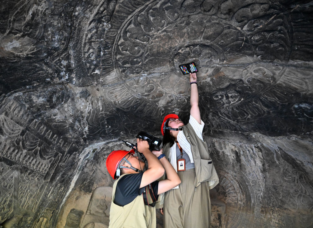 4月10日,武汉大学文化遗产智能计算实验室团队成员(下)与龙门石窟研究院工作人员在魏字洞进行高清摄影扫描。新华社记者 李嘉南 摄
